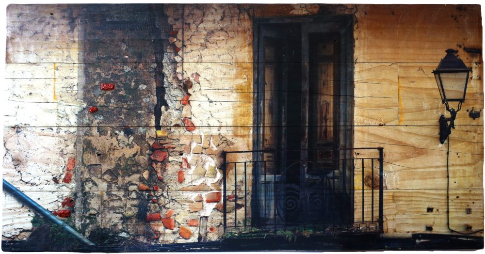 «Nadie lo sabe» Esta obra utiliza la técnica de transferencia fotográfica sobre un soporte de madera, donde el grano natural y las imperfecciones del material (como nudos y variaciones de tono) se integran de manera sinérgica con la imagen visual. La composición captura la rica textura de una fachada arquitectónica degradada, caracterizada por capas de mampostería erosionada, restos de revoque y baldosas expuestas que crean un complejo patrón de pátina natural y cromatismo terroso.