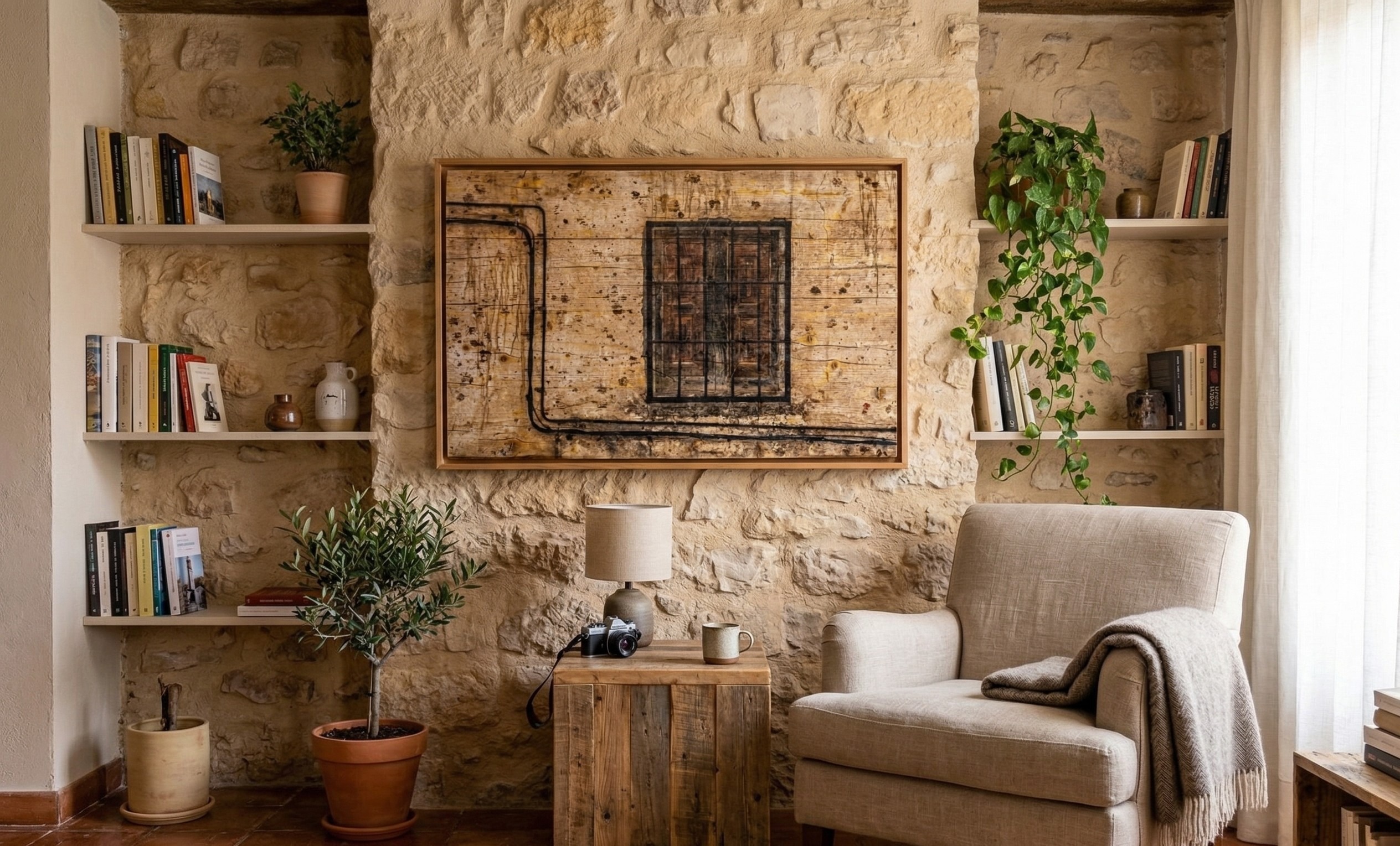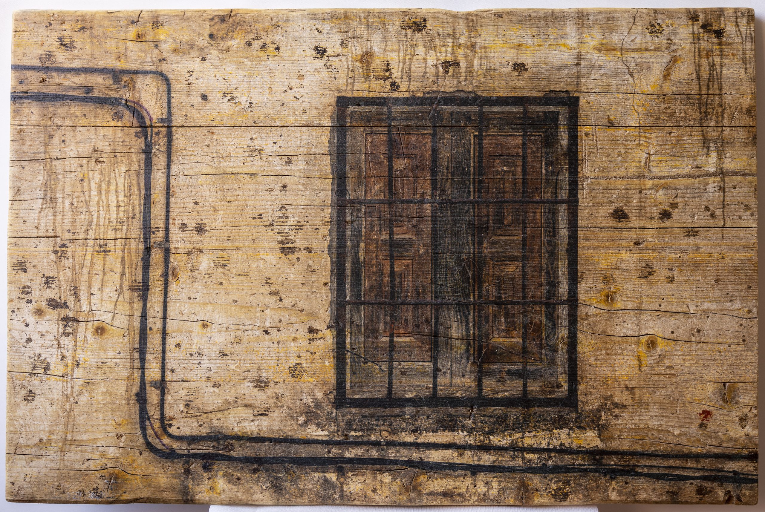 «Ventana del Retiro», de Alberto Rubio Terraza. Fotografía plástica sobre madera recuperada. Una ventana con reja de forja sobre un muro erosionado por el tiempo. La veta de la madera aporta textura y tridimensionalidad a la imagen. Una pieza única.