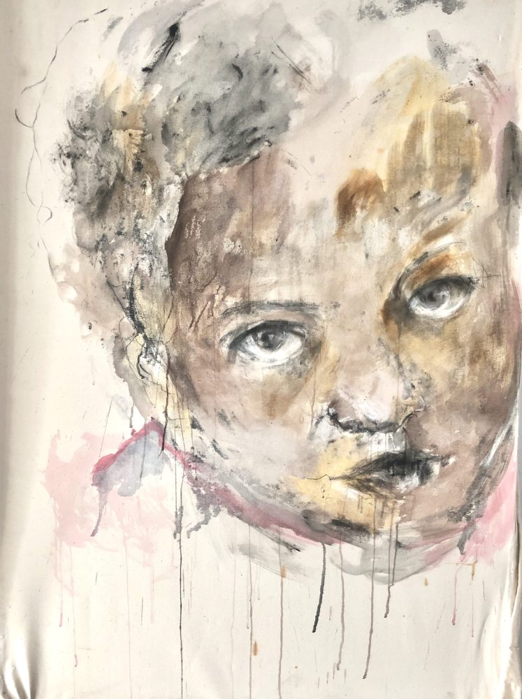 TÍTULO: «Niño». Se percibe una gran maestría en el manejo del claroscuro y la anatomía facial. La integración de trazos de grafito con manchas pictóricas demuestra una madurez estilística capaz de equilibrar el detalle con la abstracción gestual.