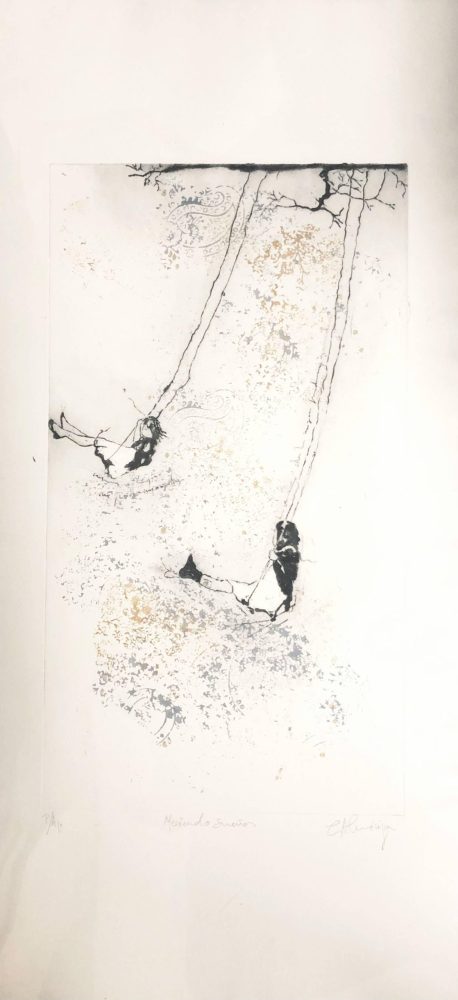 «Meciendo sueños II». Grabado de técnica mixta y estética etérea. Destaca por su trazo gestual y equilibrio compositivo; ideal para coleccionismo.