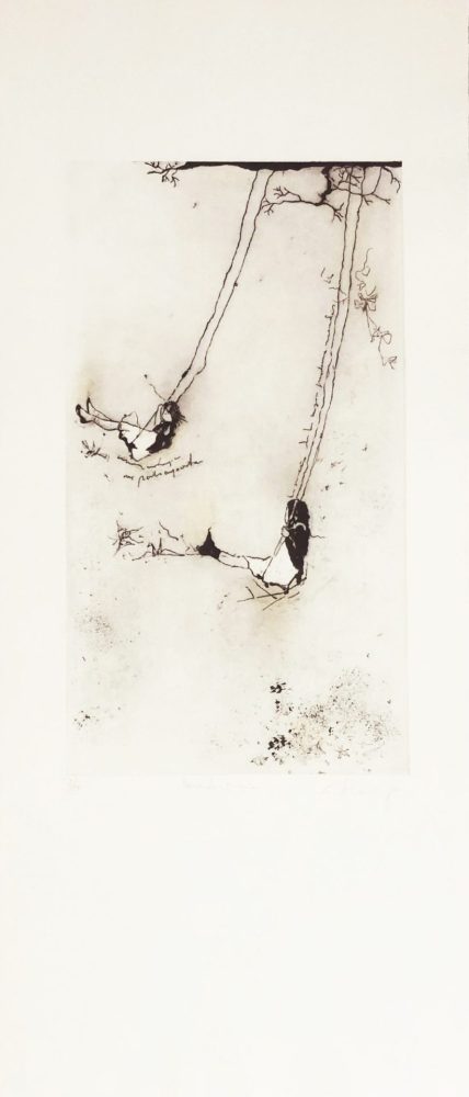 Carmen Almecija «Meciendo sueños «. Existe un uso magistral del espacio negativo (el vacío). Las figuras de las niñas en los columpios actúan como puntos de anclaje visual que rompen la monotonía del blanco, creando una sensación de ingravidez y nostalgia.