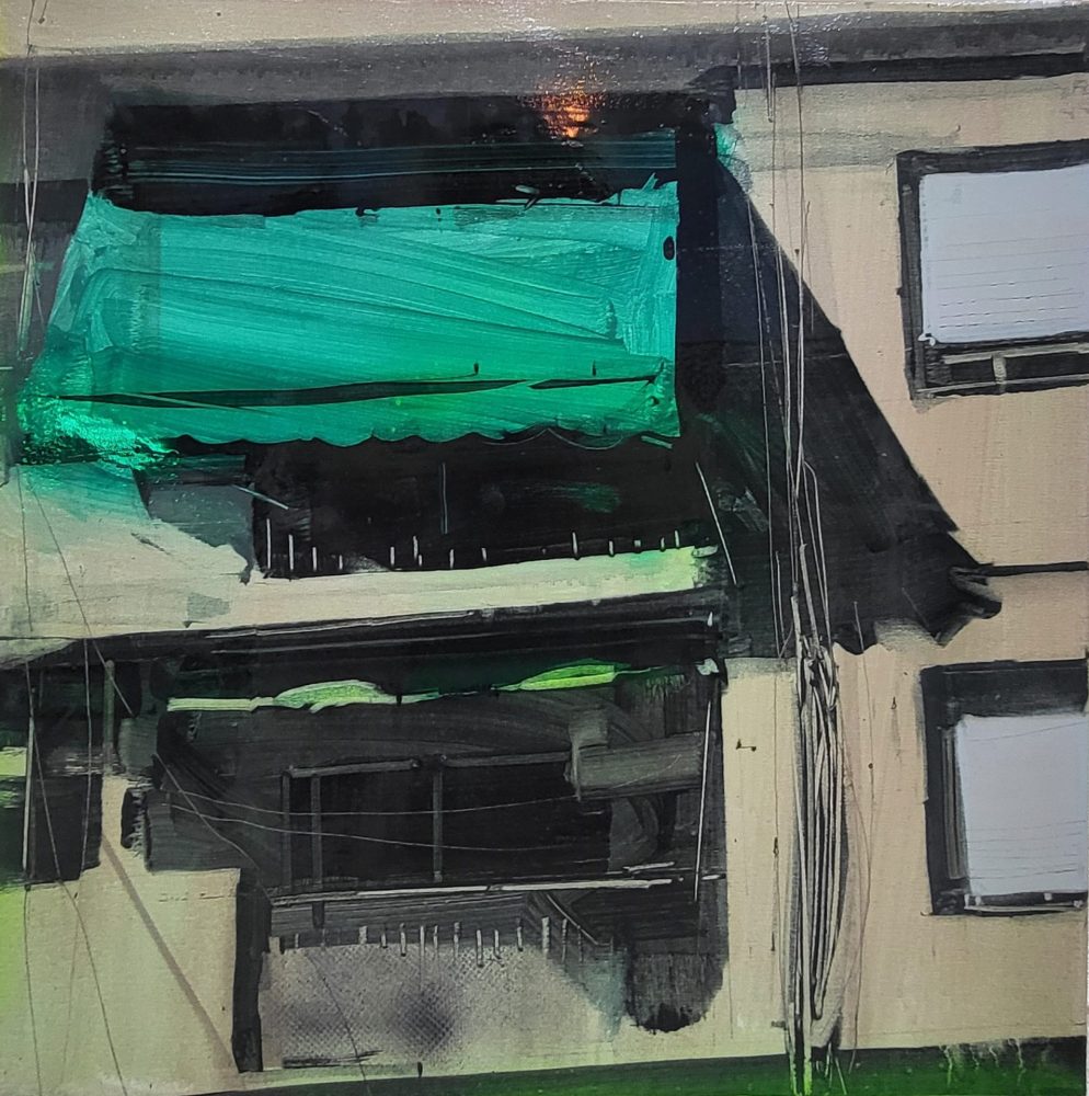 TITULO; «Green Awning» – Serie Ghetto. duelo cromático de textura y energía pura. Minimalismo audaz que redefine cualquier espacio. Adquiera hoy una joya.