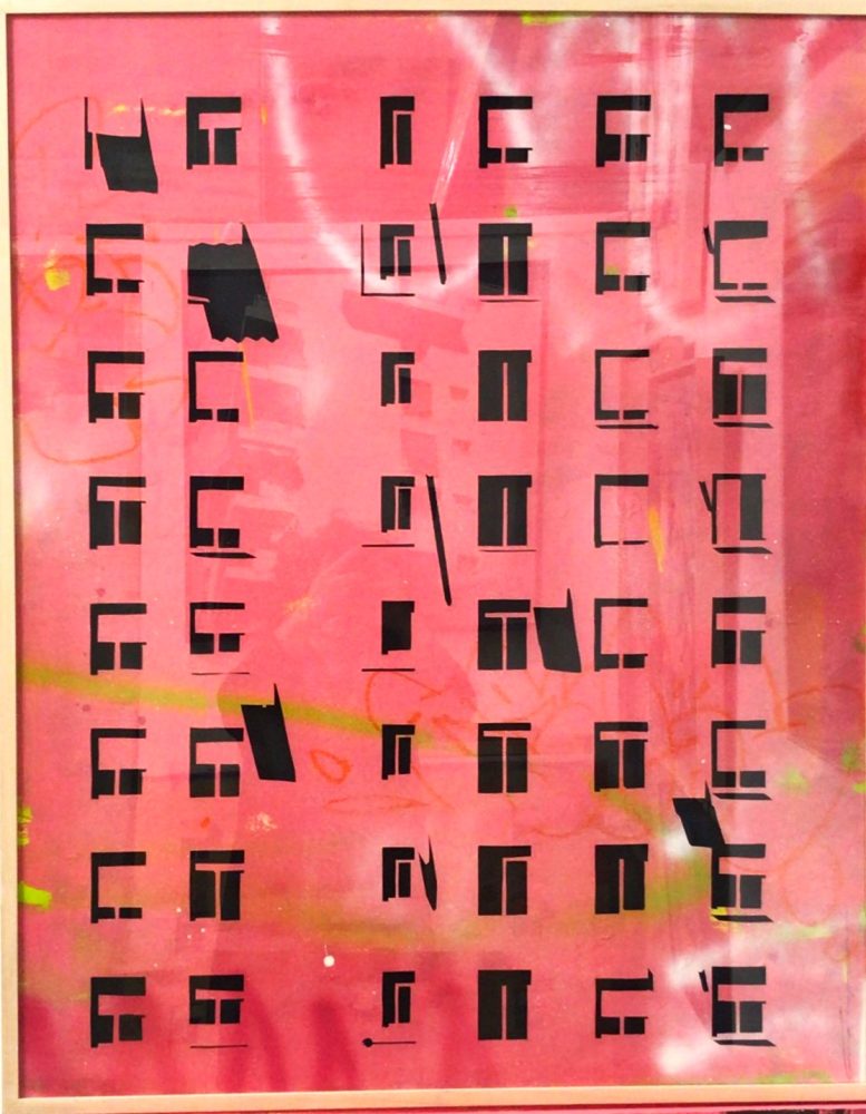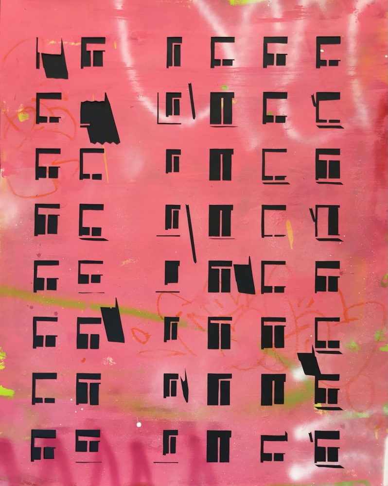 TITULO; «Pink» Serie Fachadas. Sobre la base cromática, se aplica una capa de grafismo expresivo mediante técnicas mixtas, donde el trazo libre y las manchas de pintura spray dialogan con la rigidez de la geometría subyacente.