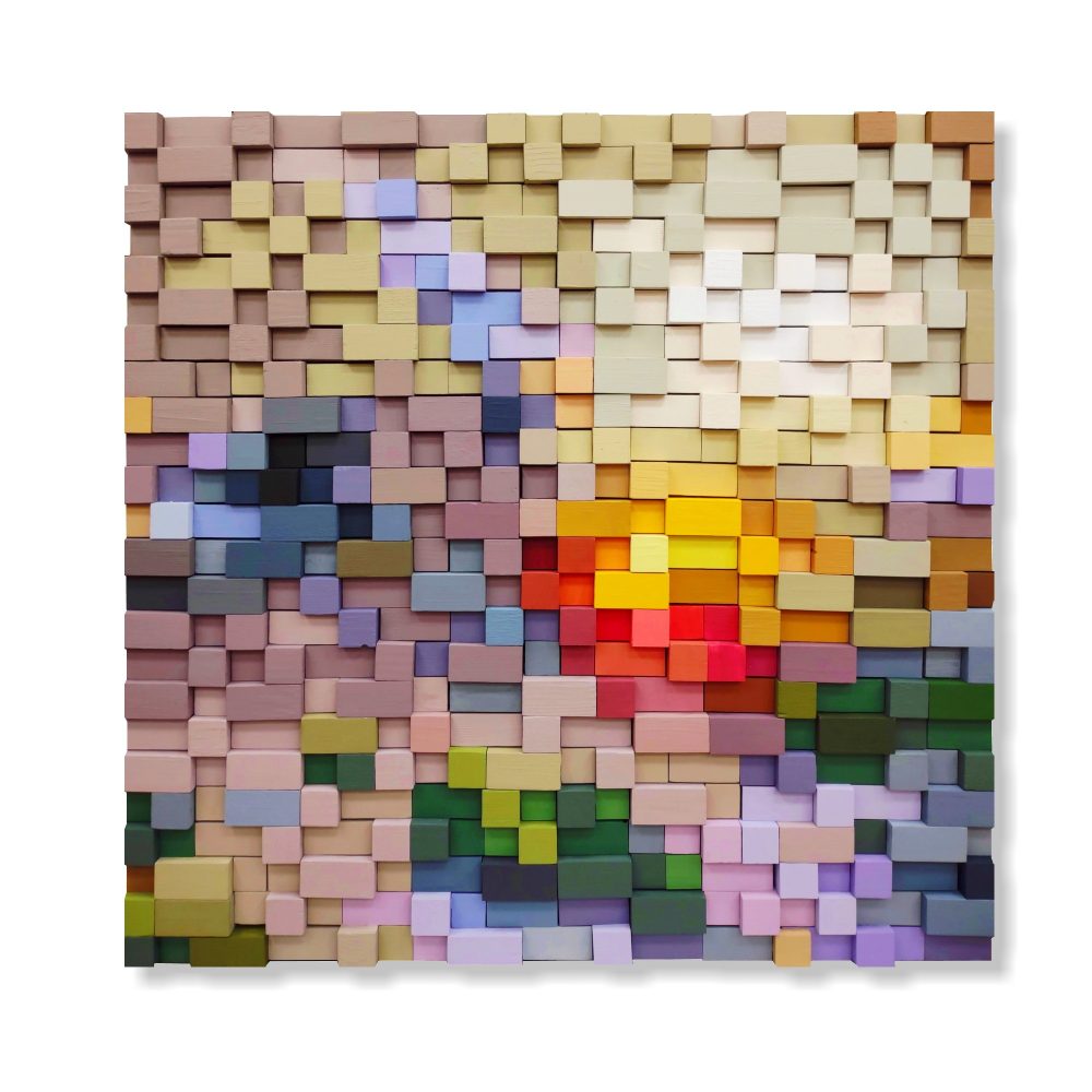 En el horizonte de esta pieza, la madera deja de ser bosque para convertirse en arena y viento. Cada taco de madera es un grano de tiempo tallado, una pequeña duna que emerge del plano para capturar la luz del atardecer.