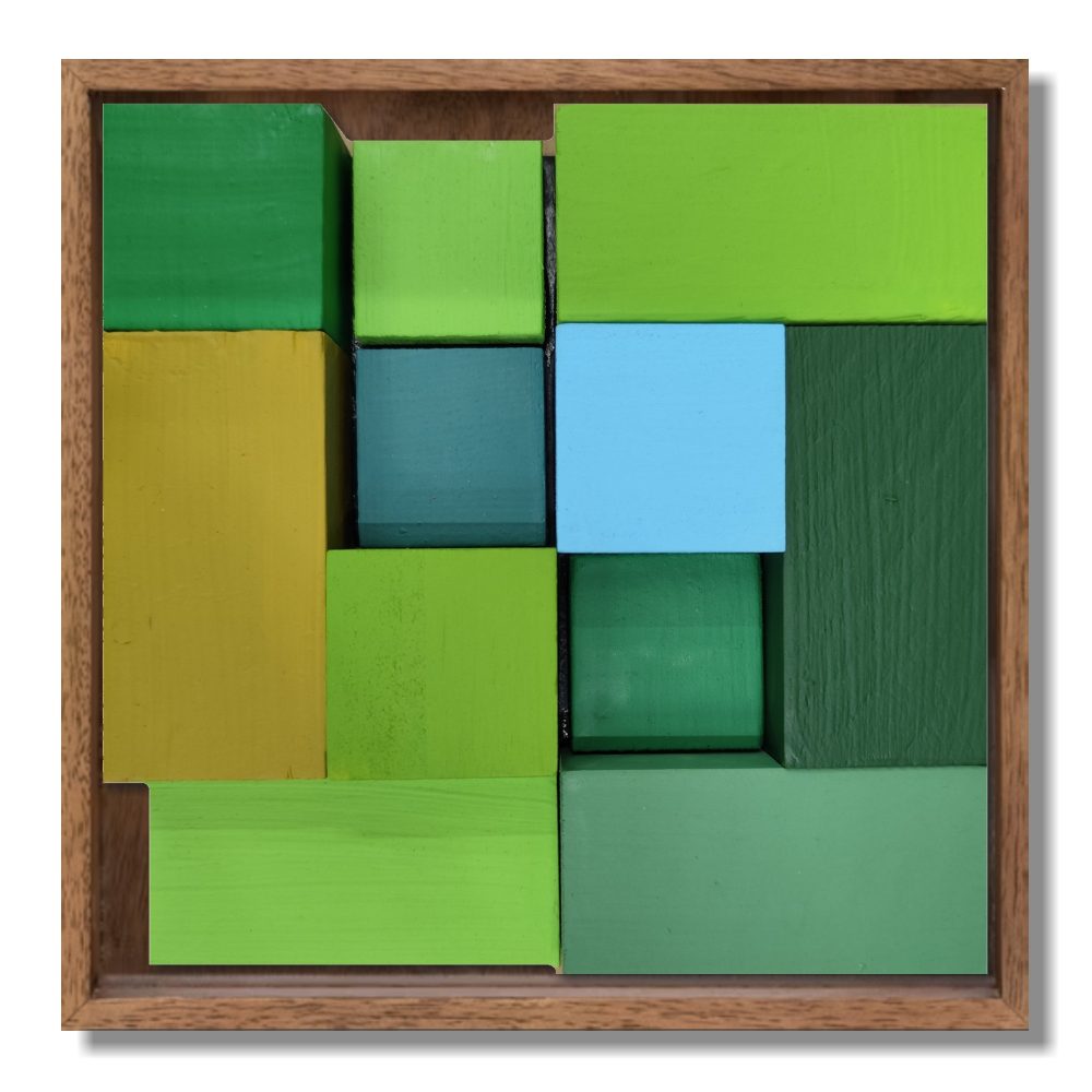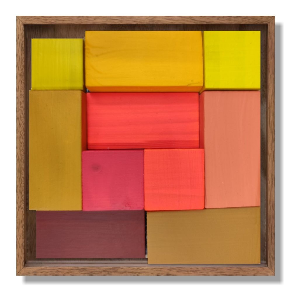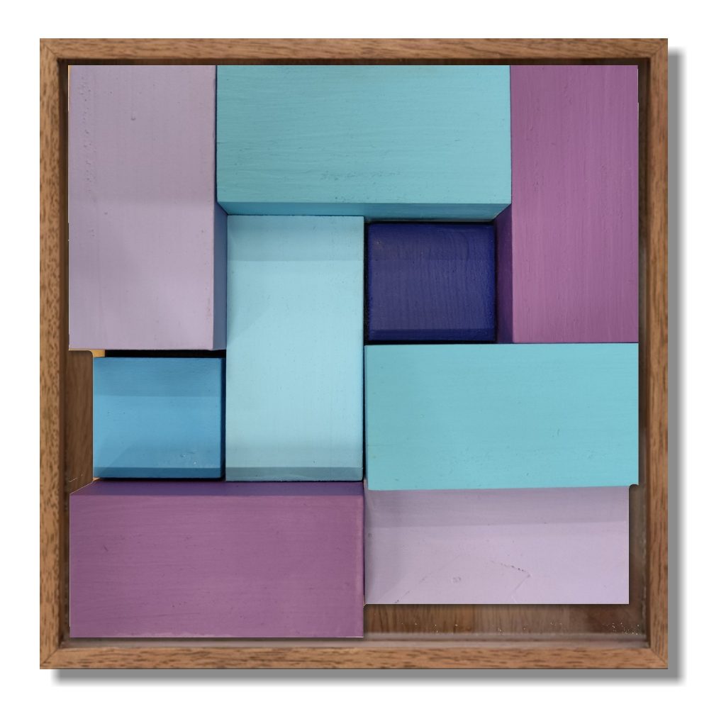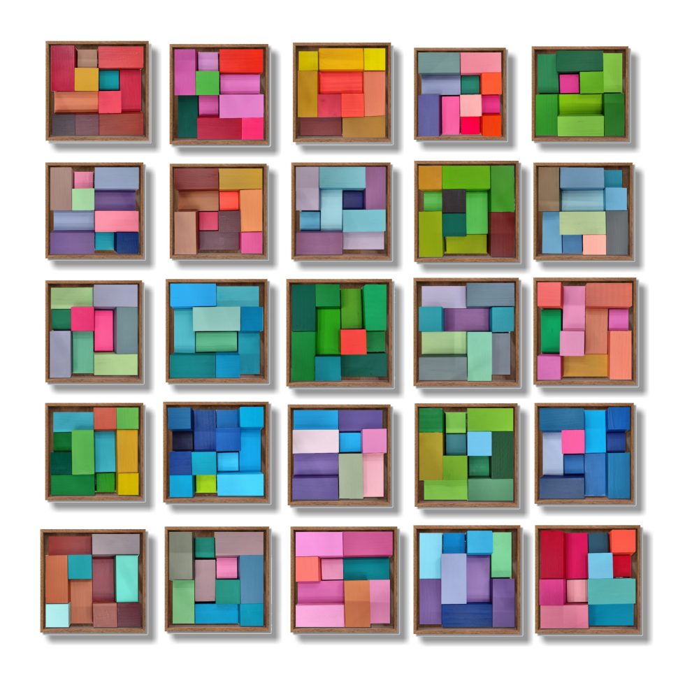 «25 ‘Runas’ de Eva Menezz: bloques de abeto ensamblados y policromados. Una historia de geometría sagrada y vanguardia que domina el espacio con luz y volumen. Las obras se venden por separado