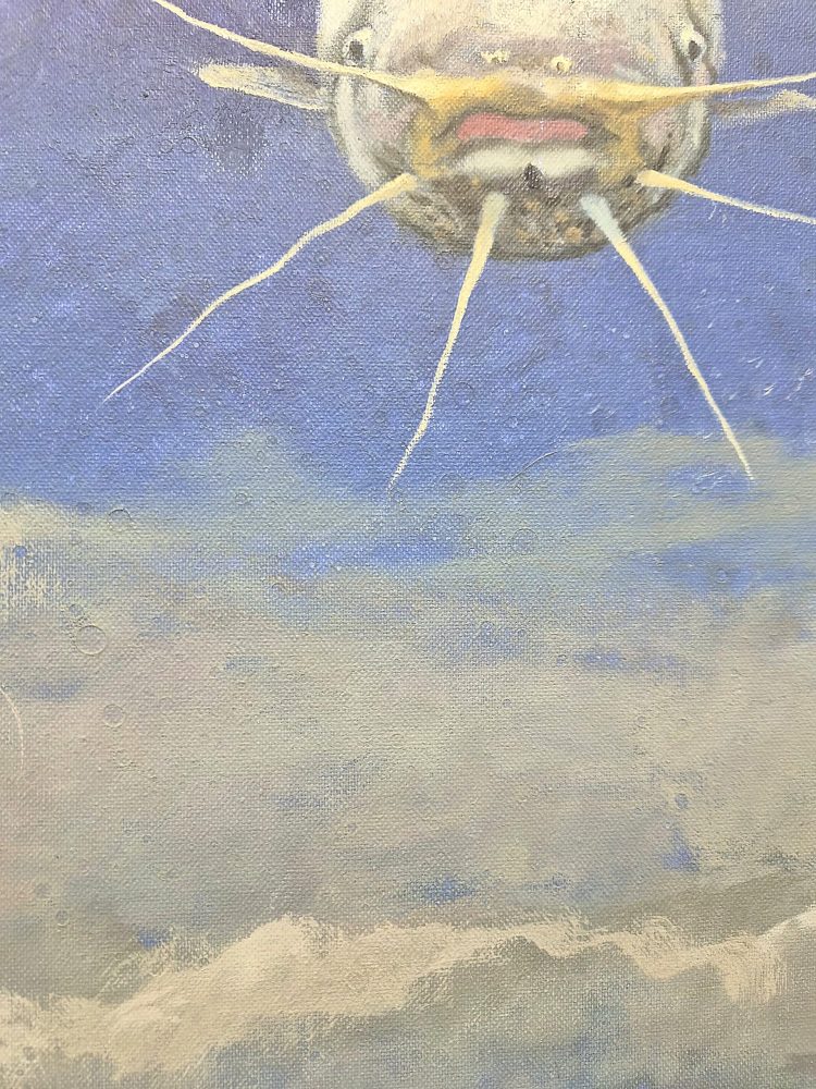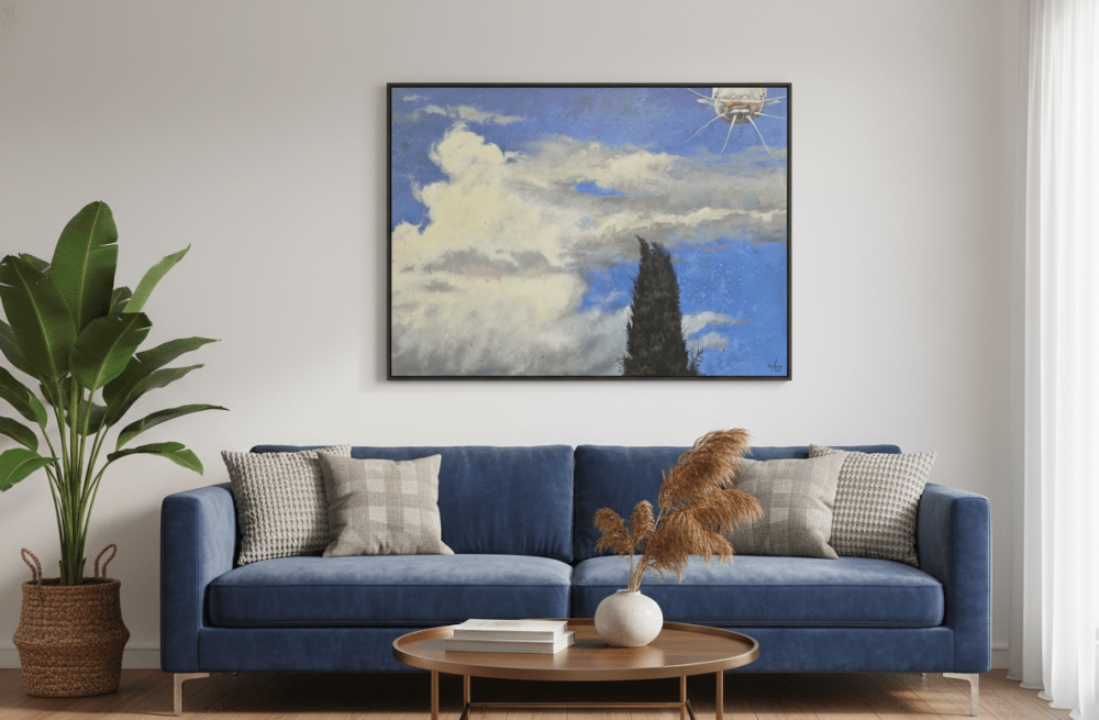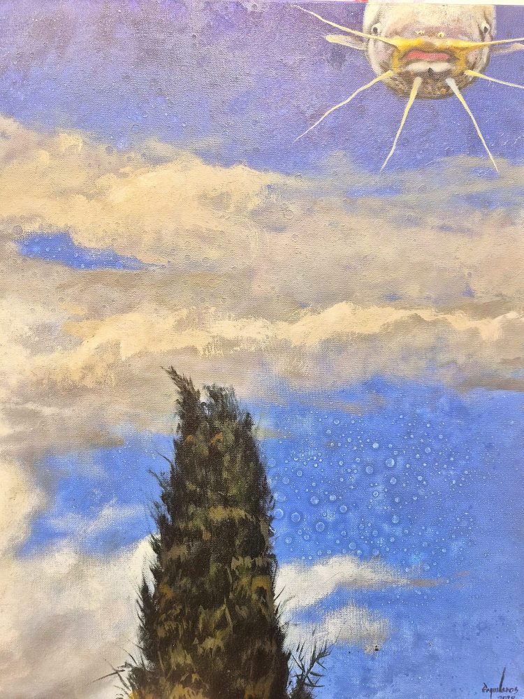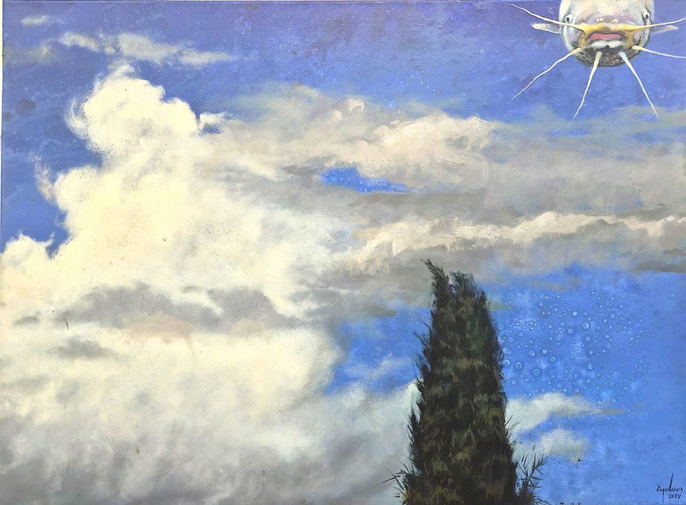 «Enguídanos rompe la lógica en este óleo: un cielo onírico donde emerge un pez fantástico. Surrealismo puro que transforma el paisaje en un océano infinito.»