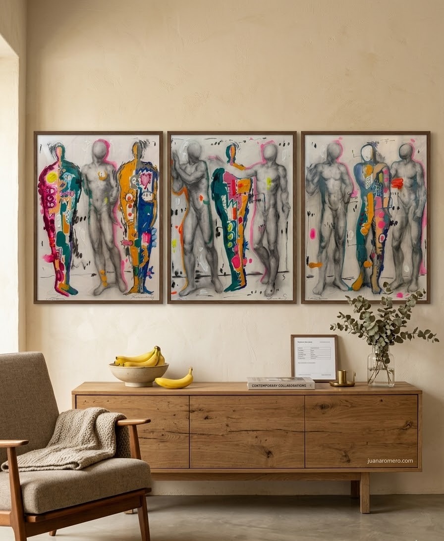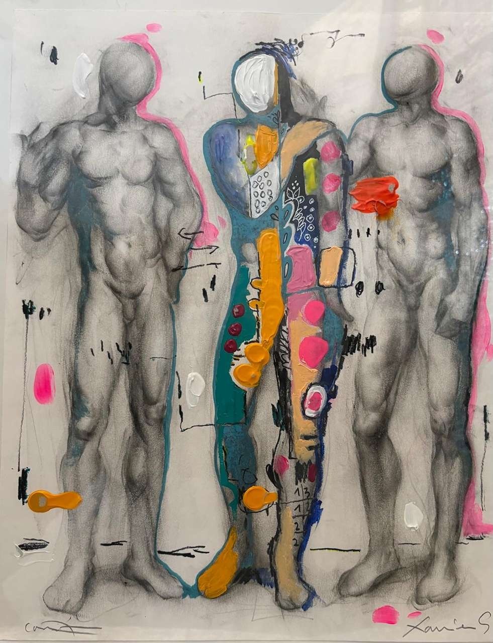 «Amics» es una pieza magistral donde la precisión anatómica de Joan Castejón se encuentra con el pulso neoexpresionista de Xavi García. Realizada en cera y acrílico sobre papel, esta obra equilibra la fuerza del dibujo clásico con una explosión cromática audaz y matérica.
